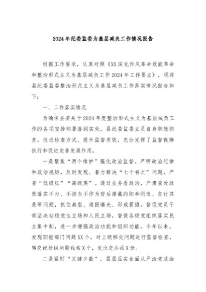 【七哥公文】2024年:2024年纪委监委为基层减负工作情况报告+更多免费公文+VX:QiGeGongWen2024