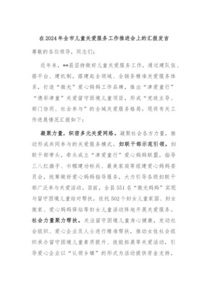 【七哥公文】2024年:在2024年全市儿童关爱服务工作推进会上的汇报发言+更多免费公文+VX:QiGeGongWen2024