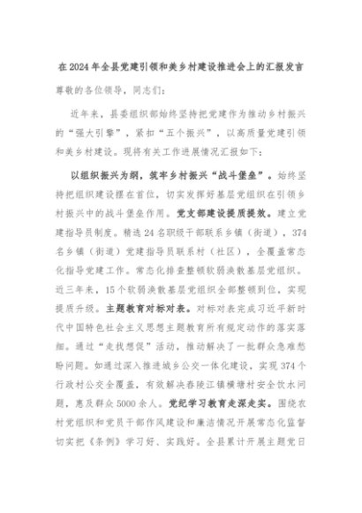 【七哥公文】2024年:在2024年全县党建引领和美乡村建设推进会上的汇报发言+更多免费公文+VX:QiGeGongWen2024