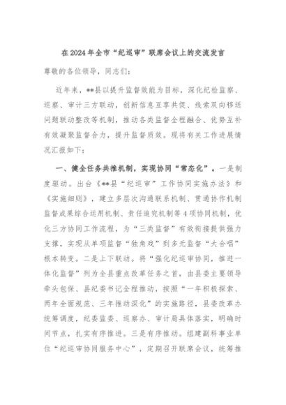 / 【七哥公文】2024年:在2024年全市“纪巡审”联席会议上的交流发言+更多免费公文+VX:QiGeGongWen2024