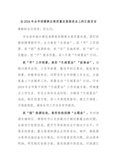 【七哥公文】2024年:在2024年全市供暖事业高质量发展推进会上的汇报发言+更多免费公文+VX:QiGeGongWen2024