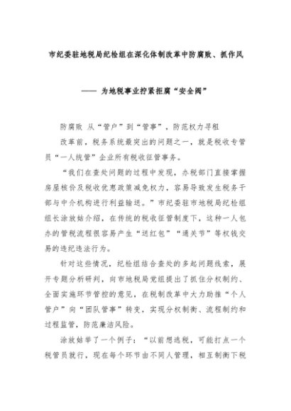 【七哥公文】2024年:市纪委驻地税局纪检组在深化体制改革中防腐败、抓作风—— 为地税事业拧紧拒腐“安全阀”+更多免费公文+VX:QiGeGongWen2024