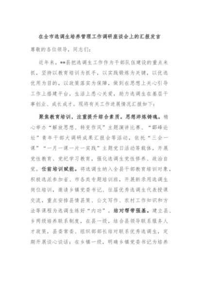 / 【七哥公文】2024年:在全市选调生培养管理工作调研座谈会上的汇报发言+更多免费公文+VX:QiGeGongWen2024