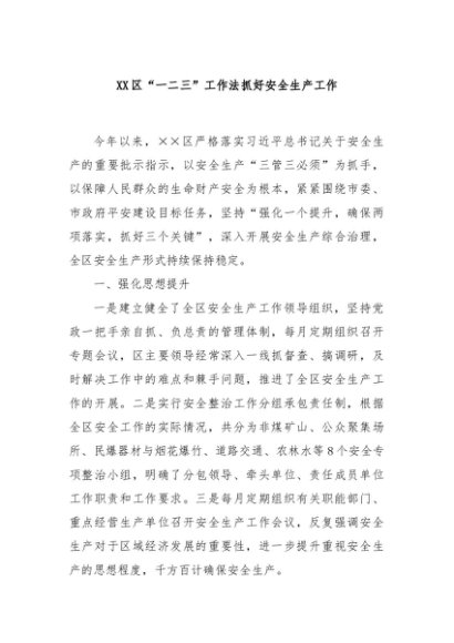 / 【七哥公文】2024年:XX区“一二三”工作法抓好安全生产工作+更多免费公文+VX:QiGeGongWen2024