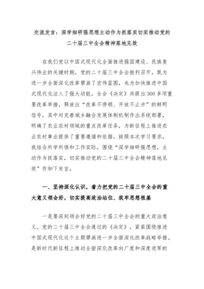 【七哥公文】2024年:交流发言:深学细研强思想主动作为抓落实切实推动党的二十届三中全会精神落地见效+更多免费公文+VX:QiGeGongWen2024
