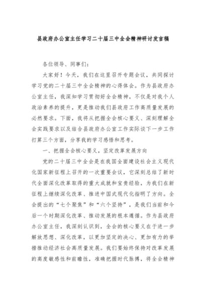/ 【七哥公文】2024年:县政府办公室主任学习二十届三中全会精神研讨发言稿+更多免费公文+VX:QiGeGongWen2024