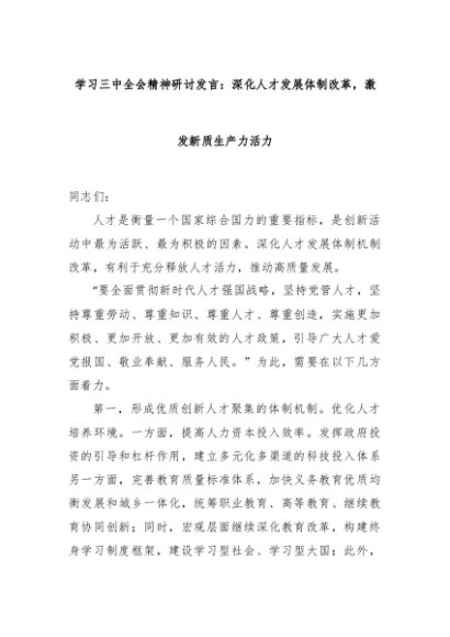 【七哥公文】2024年:学习三中全会精神研讨发言:深化人才发展体制改革,激发新质生产力活力+更多免费公文+VX:QiGeGongWen2024