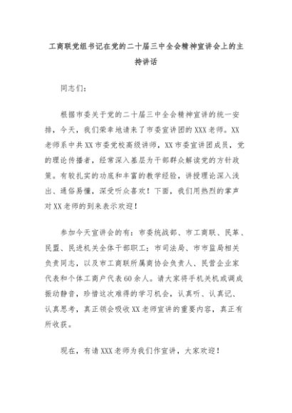 【七哥公文】2024年:工商联党组书记在党的二十届三中全会精神宣讲会上的主持讲话+更多免费公文+VX:QiGeGongWen2024