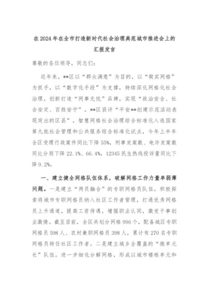 【七哥公文】2024年:在2024年在全市打造新时代社会治理典范城市推进会上的汇报发言+更多免费公文+VX:QiGeGongWen2024