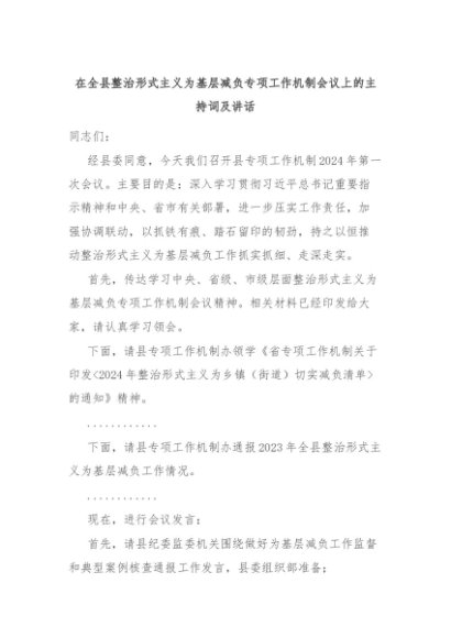 【七哥公文】2024年:在全县整治形式主义为基层减负专项工作机制会议上的主持词及讲话+更多免费公文+VX:QiGeGongWen2024