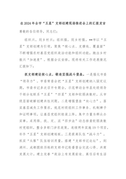 【七哥公文】2024年:在2024年全市“五星”支部创建现场推进会上的汇报发言+更多免费公文+VX:QiGeGongWen2024
