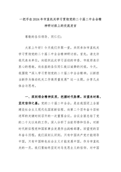 【七哥公文】2024年:一把手在2024年市直机关学习贯彻党的二十届二中全会精神研讨班上的交流发言+更多免费公文+VX:QiGeGongWen2024
