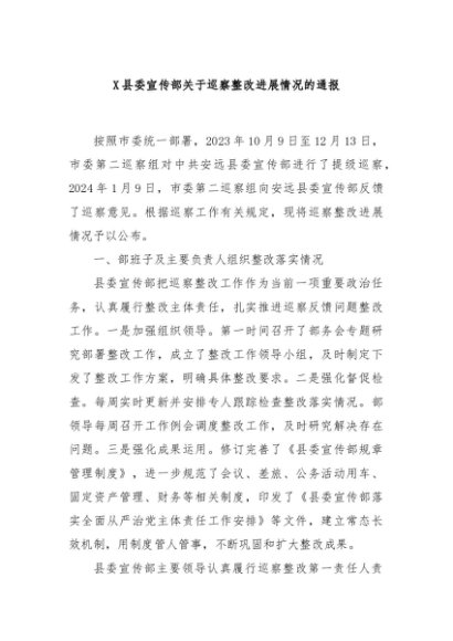 / 【七哥公文】2024年:X县委宣传部关于巡察整改进展情况的通报+更多免费公文+VX:QiGeGongWen2024