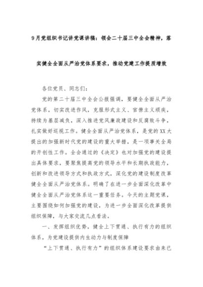 【七哥公文】2024年:9月党组织书记讲党课讲稿:领会二十届三中全会精神,落实健全全面从严治党体系要求,推动党建工作提质增效+更多免费公文+VX:QiGeGongWen2024