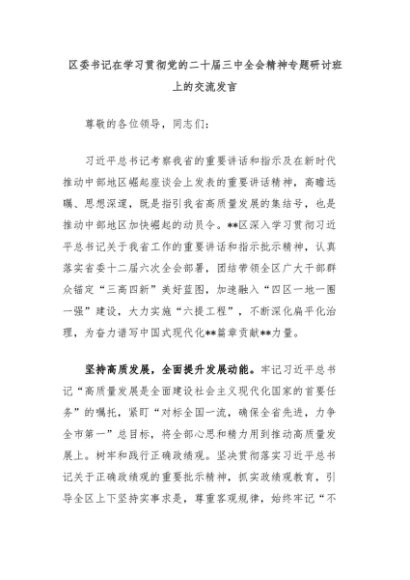 【七哥公文】2024年:区委书记在学习贯彻党的二十届三中全会精神专题研讨班上的交流发言+更多免费公文+VX:QiGeGongWen2024