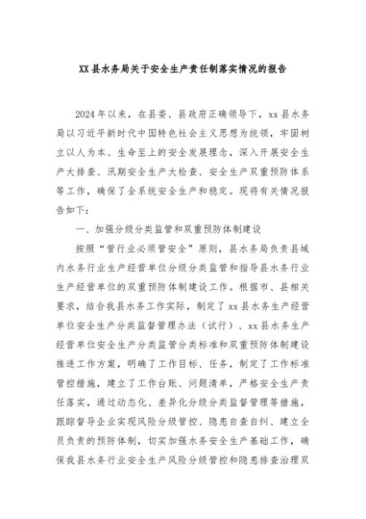 / 【七哥公文】2024年:XX县水务局关于安全生产责任制落实情况的报告+更多免费公文+VX:QiGeGongWen2024