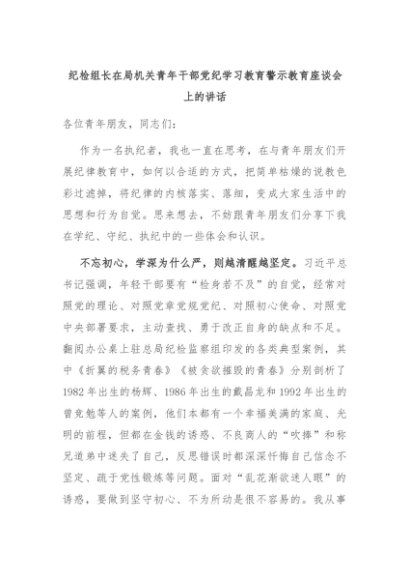 【七哥公文】2024年:纪检组长在局机关青年干部党纪学习教育警示教育座谈会上的讲话+更多免费公文+VX:QiGeGongWen2024