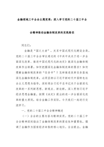 【七哥公文】2024年:金融领域三中全会主题党课:深入学习党的二十届三中全会精神推动金融体制改革的实践路径+更多免费公文+VX:QiGeGongWen2024