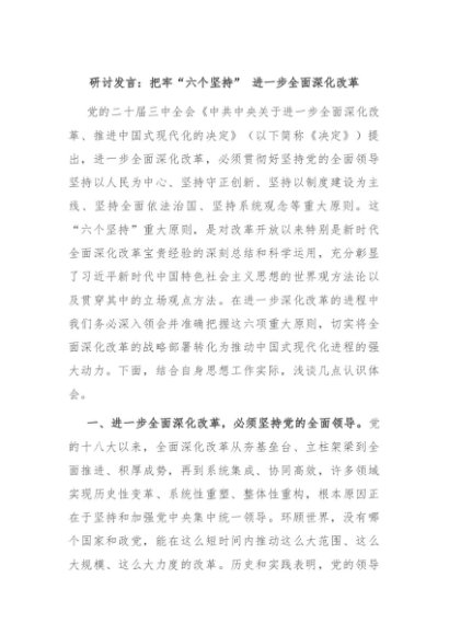 【七哥公文】2024年:研讨发言:把牢“六个坚持” 进一步全面深化改革+更多免费公文+VX:QiGeGongWen2024