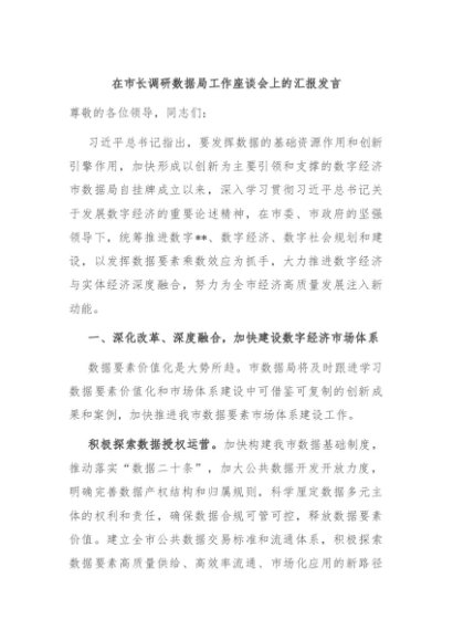 / 【七哥公文】2024年:在市长调研数据局工作座谈会上的汇报发言+更多免费公文+VX:QiGeGongWen2024