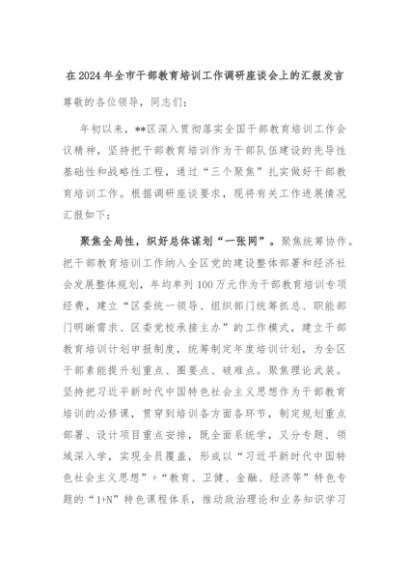 【七哥公文】2024年:在2024年全市干部教育培训工作调研座谈会上的汇报发言+更多免费公文+VX:QiGeGongWen2024