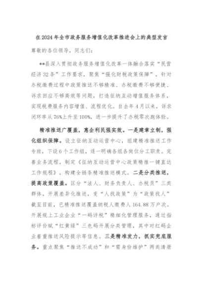 【七哥公文】2024年:在2024年全市政务服务增值化改革推进会上的典型发言+更多免费公文+VX:QiGeGongWen2024