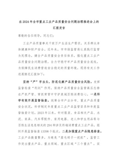 【七哥公文】2024年:在2024年全市重点工业产品质量安全问题治理推进会上的汇报发言+更多免费公文+VX:QiGeGongWen2024