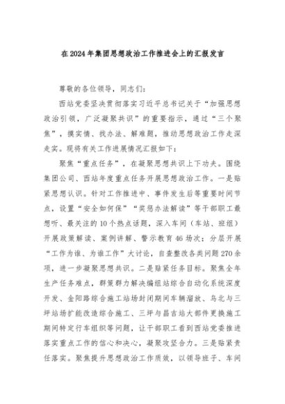/ 【七哥公文】2024年:在2024年集团思想政治工作推进会上的汇报发言+更多免费公文+VX:QiGeGongWen2024