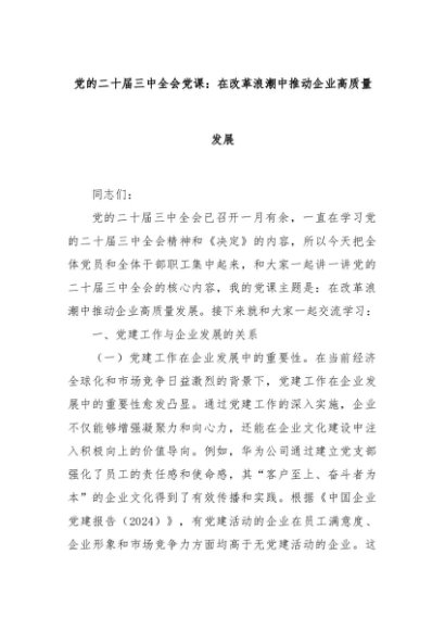 【七哥公文】2024年:党的二十届三中全会党课:在改革浪潮中推动企业高质量发展+更多免费公文+VX:QiGeGongWen2024