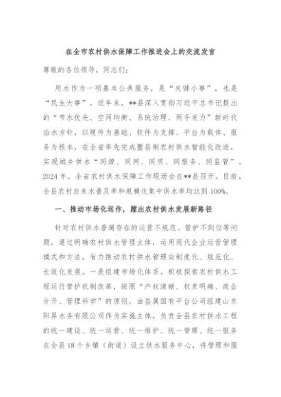 / 【七哥公文】2024年:在全市农村供水保障工作推进会上的交流发言+更多免费公文+VX:QiGeGongWen2024