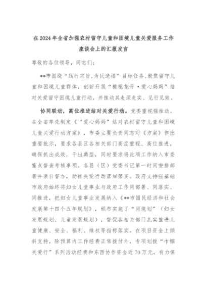 【七哥公文】2024年:在2024年全省加强农村留守儿童和困境儿童关爱服务工作座谈会上的汇报发言+更多免费公文+VX:QiGeGongWen2024