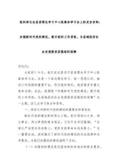 【七哥公文】2024年:组织部长在县委理论学习中心组集体学习会上的发言材料:加强新时代党的建设,提升组织工作质效,为县域经济社会发展提供坚强组织保障+更多免费公文+VX:QiGeGongWen2024