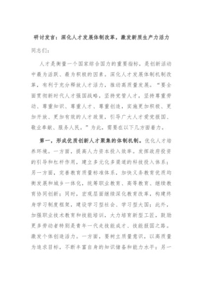 【七哥公文】2024年:研讨发言:深化人才发展体制改革,激发新质生产力活力+更多免费公文+VX:QiGeGongWen2024