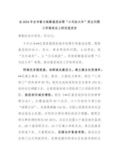 【七哥公文】2024年:在2024年全市着力破解基层治理“小马拉大车”突出问题工作推进会上的交流发言+更多免费公文+VX:QiGeGongWen2024