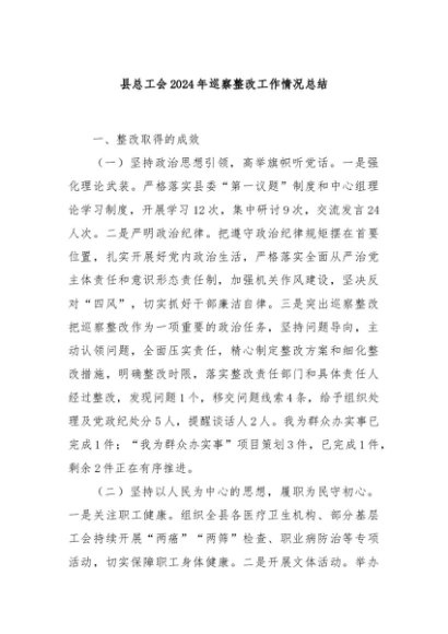 / 【七哥公文】2024年:县总工会2024年巡察整改工作情况总结+更多免费公文+VX:QiGeGongWen2024