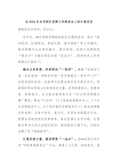/ 【七哥公文】2024年:在2024年全市街区党建工作推进会上的汇报发言+更多免费公文+VX:QiGeGongWen2024