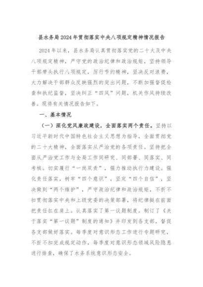 【七哥公文】2024年:县水务局2024年贯彻落实中央八项规定精神情况报告+更多免费公文+VX:QiGeGongWen2024
