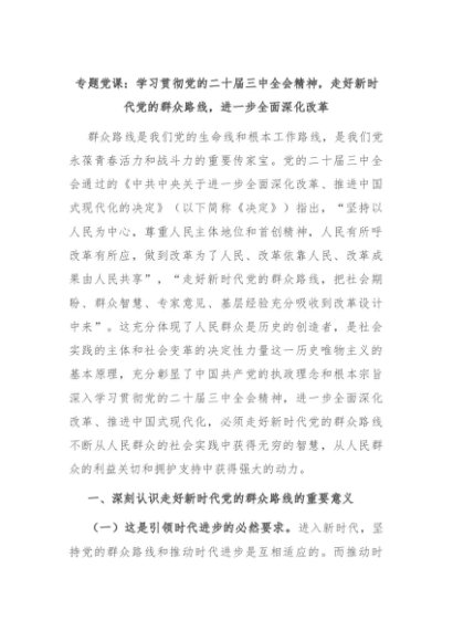 【七哥公文】2024年:专题党课:学习贯彻党的二十届三中全会精神,走好新时代党的群众路线,进一步全面深化改革+更多免费公文+VX:QiGeGongWen2024