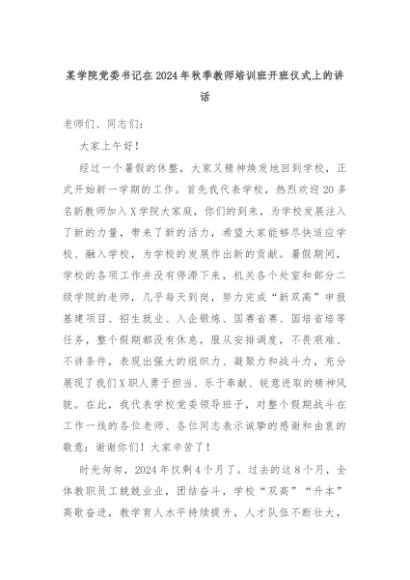 【七哥公文】2024年:某学院党委书记在2024年秋季教师培训班开班仪式上的讲话+更多免费公文+VX:QiGeGongWen2024