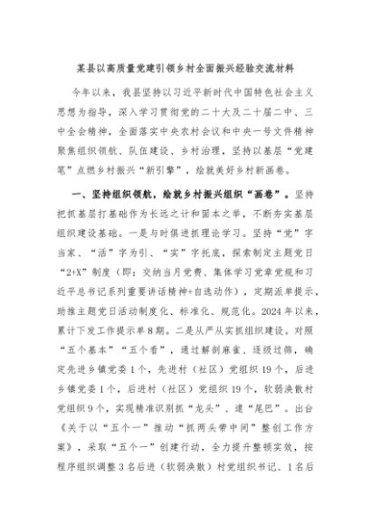 / 【七哥公文】2024年:某县以高质量党建引领乡村全面振兴经验交流材料+更多免费公文+VX:QiGeGongWen2024