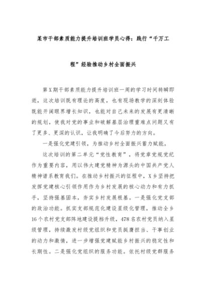 【七哥公文】2024年:某市干部素质能力提升培训班学员心得:践行“千万工程”经验推动乡村全面振兴+更多免费公文+VX:QiGeGongWen2024