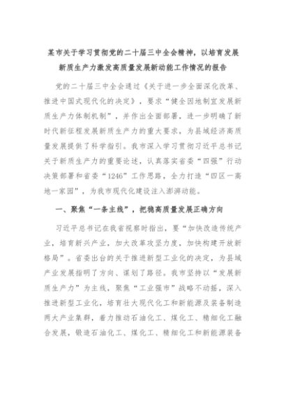 【七哥公文】2024年:某市关于学习贯彻党的二十届三中全会精神,以培育发展新质生产力激发高质量发展新动能工作情况的报告+更多免费公文+VX:QiGeGongWen2024