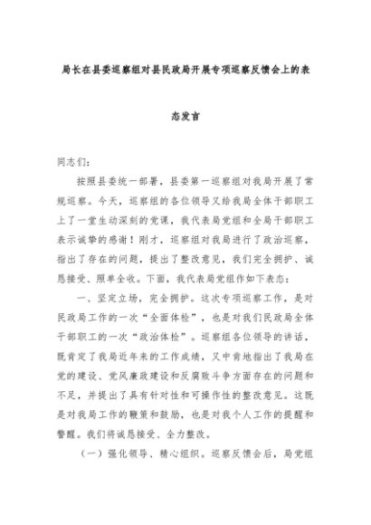 【七哥公文】2024年:局长在县委巡察组对县民政局开展专项巡察反馈会上的表态发言+更多免费公文+VX:QiGeGongWen2024