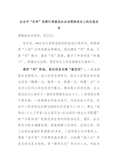 【七哥公文】2024年:在全市“近邻”党建引领基层社会治理推进会上的交流发言+更多免费公文+VX:QiGeGongWen2024