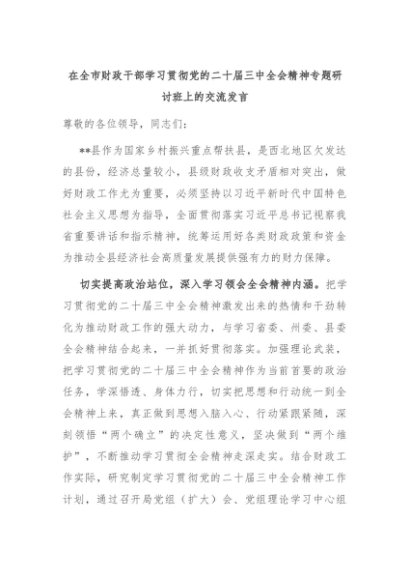 【七哥公文】2024年:在全市财政干部学习贯彻党的二十届三中全会精神专题研讨班上的交流发言+更多免费公文+VX:QiGeGongWen2024