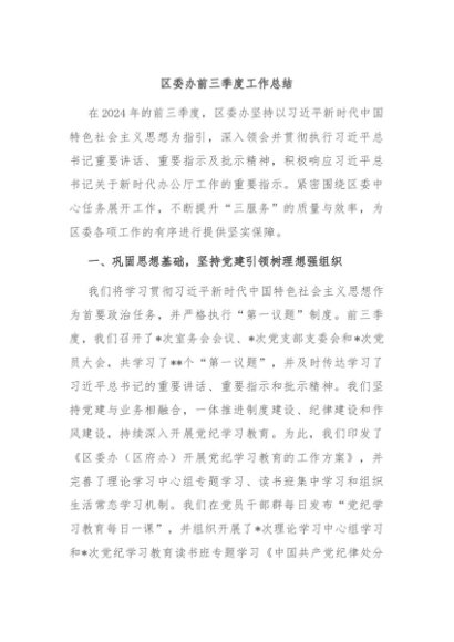 / 【七哥公文】2024年:区委办前三季度工作总结+更多免费公文+VX:QiGeGongWen2024