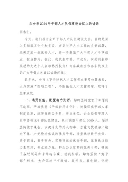 / 【七哥公文】2024年:在全市2024年干部人才队伍建设会议上的讲话+更多免费公文+VX:QiGeGongWen2024