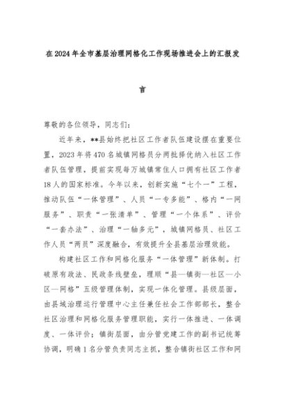 【七哥公文】2024年:在2024年全市基层治理网格化工作现场推进会上的汇报发言+更多免费公文+VX:QiGeGongWen2024