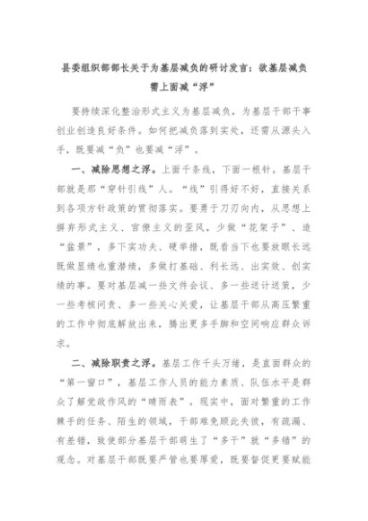 【七哥公文】2024年:县委组织部部长关于为基层减负的研讨发言:欲基层减负 需上面减“浮”+更多免费公文+VX:QiGeGongWen2024