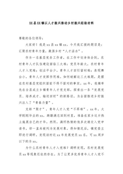 / 【七哥公文】2024年:XX县XX镇以人才振兴推动乡村振兴经验材料+更多免费公文+VX:QiGeGongWen2024